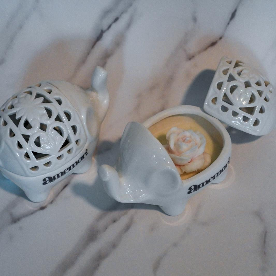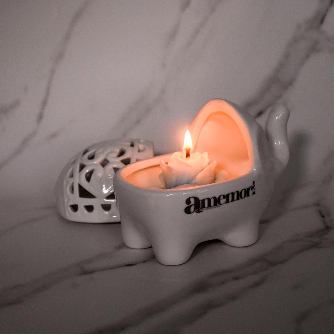 A symbol of wisdom and gentle strength, this candle rests within a sculpted elephant vessel. Inside, a delicate flower bloom awaits, and when the flame is lit, its glow shines through the carved cover — casting intricate patterns of light that dance across the room. A flame of serenity, a guardian of grace.